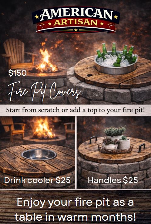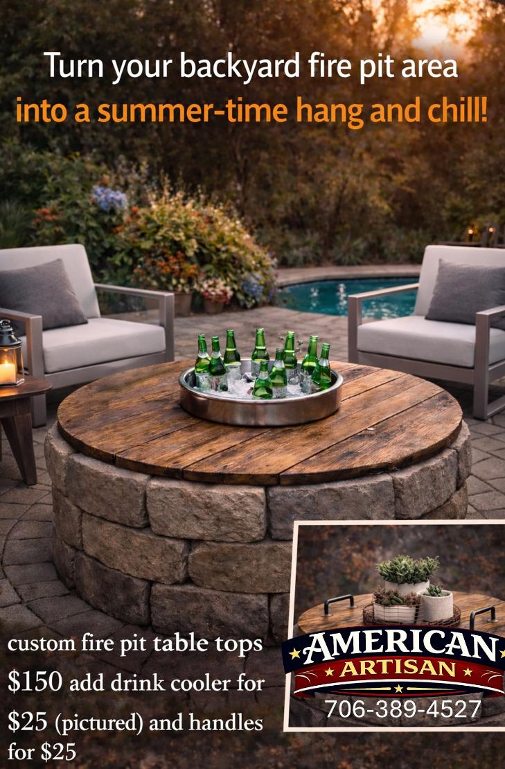 Fire pit covers, spool tables & custom carpentry available locally in Northeast Georgia only — unless you’d like to make the trip and pick it up yourself!